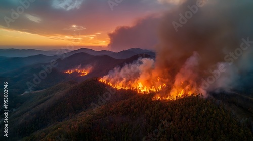 Aerial view of a forest fire at sunset, showcasing flames and smoke in a natural landscape.