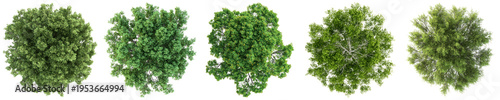 aerial top-down view collection of various green deciduous trees with lush foliage, showcasing different shapes and textures.