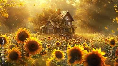 Golden hour sunflowers field with rustic farmhouse and misty forest background idyllic rural