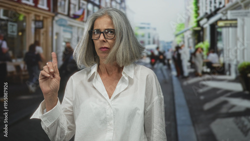 Woman points finger on busy city street, grey haired middle aged wearing glasses and white blouse looking stern; firm disapproval.