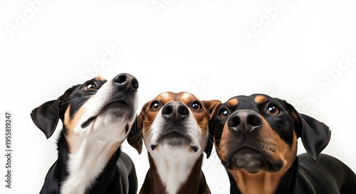 Banner de primer plano con la cabeza de tres perros escondidos hambrientos. Aislado sobre fondo blanco.
