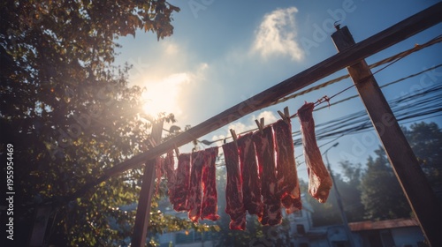 Freshly Hung Meat Strips Drying in the Sun Against a Bright Sky with Glowing Clouds and Trees in the Background for Outdoor Culinary Scene