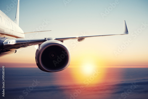 Aircraft flight over the clouds during sunrise