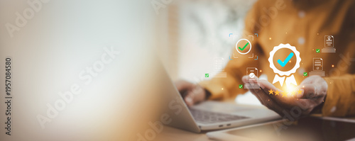 Businessman touching standard quality control , Businessman using digital interface showing certification badge, quality assurance, standards compliance, and excellence in performance.