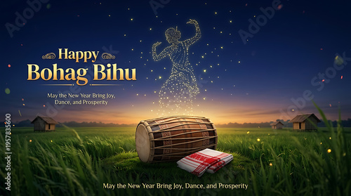 Happy bohag bihu celebration with traditional assamese drum and dance in a rural field at sunset