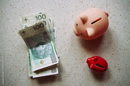 polskie banknoty i świnka skarbonka