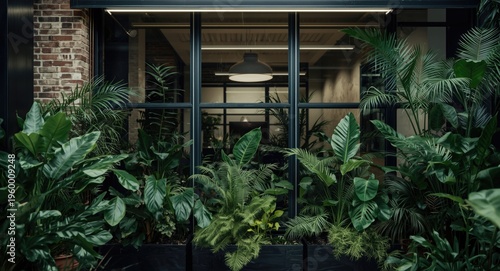 Office environment planted with green flora, brick interior walls, and glass window in subdued light copy space