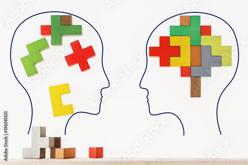The concept of rational and irrational thinking of two people. Heads of two people with colourful shapes of abstract brain for concept of idea and teamwork. Two people with different thinking.