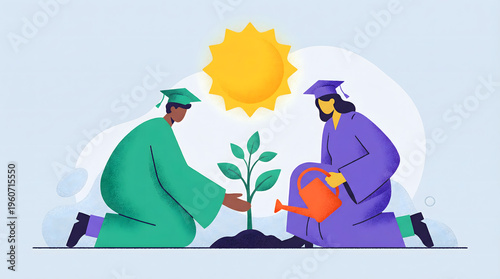 Flat illustration of two graduates planting and watering a young tree under a bright sun. Conceptual art representing education, growth, sustainability, and nurturing a successful future.