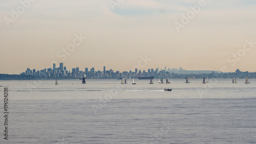 Plenty of yachts on the ocean in front of the big high rise modern city far away in the horizon