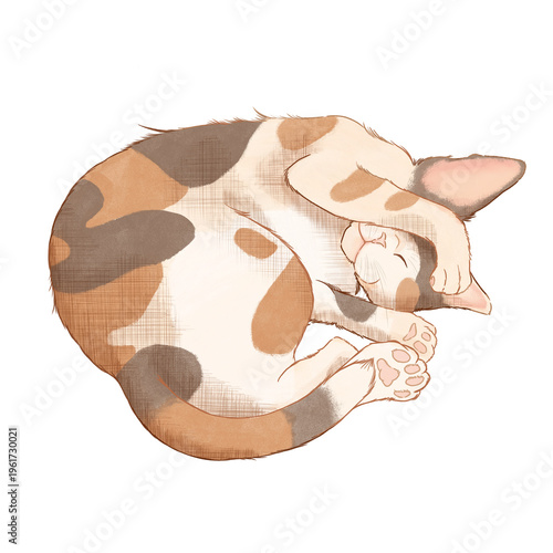 Sleeping calico cat illustration, curled up cute cat hand drawn style 寝ている三毛猫のイラスト
