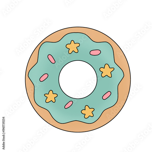 Sweet pastel donut illustration with teal glaze and tiny yellow stars, perfect for food decoration and desserts