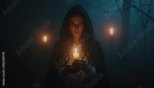 Una figura encapuchada sostiene una vela en un entorno oscuro y místico.