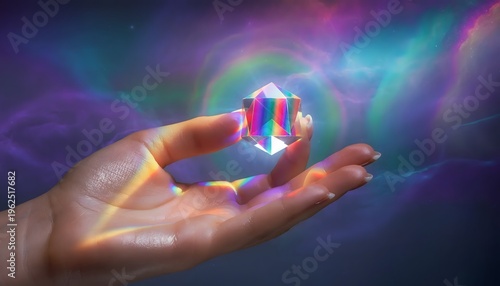 Hand holding a prism refracting light into a spectrum of colors against a colorful background.