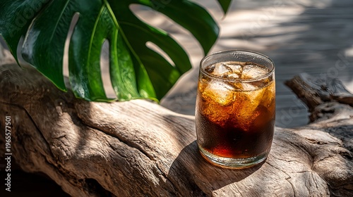 流木の上に置かれた氷たっぷりの冷たいアイスコーヒーとモンステラの葉、夏の日差しが心地よい木漏れ日の風景 - カフェ、リゾート、リラックス、自然なライフスタイルのイメージに
