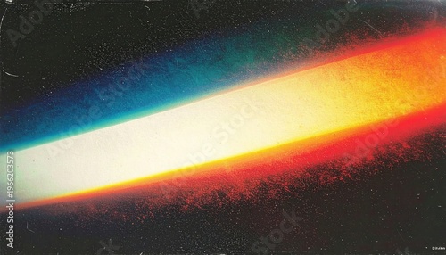 Striscia diagonale di luce prismatica, effetto flare vintage con grana e aberrazione cromatica su sfondo scuro.