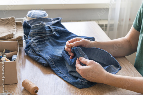 Woman's hands sewing and repairing old denim jeans. Sustainable clothing repair, diy craft, and upcycling concept. Reusing things. Environmental awareness