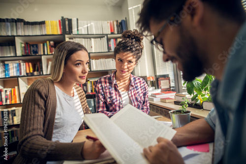 Close up of two smiling lovely cheerful young student girls sitting in the high school library and looking flirty in group mate while reding a book.
