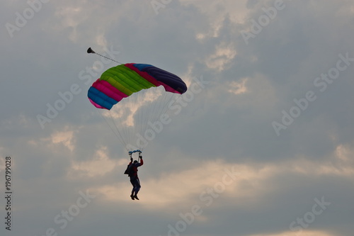 Paralotniarz ląduje, kolorowa czasza spadochronu, w tle pochmurne niebo