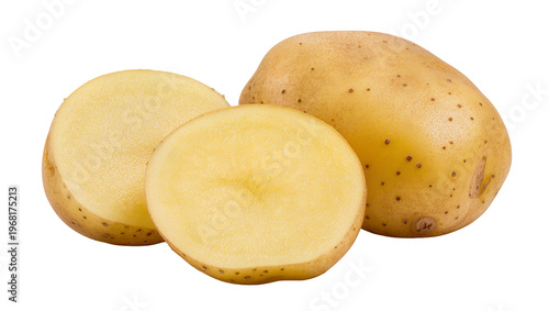 Three raw russet potatoes one halved to reveal starchy flesh, isolated on transparent background for culinary recipe designs and food advertising