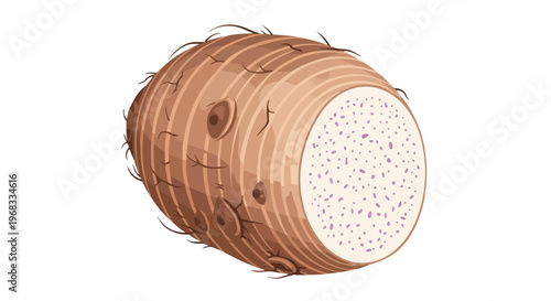 Stylized illustration of a whole taro root vegetable cut in half revealing its speckled starchy interior and fibrous brown skin