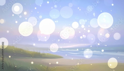 Marzycielski krajobraz nadmorski z rozmytymi białymi kręgami światła bokeh unoszącymi się nad piaszczystą plażą i spokojnym oceanem o zachodzie słońca.