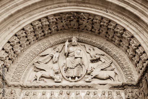 Church of St. Trophime in Arles. Jesus Christ surrounded by Four Evangelists (represented as winged man, lion, ox and eagle) and angels above entrance to church. Provence, France. Sepia historic photo