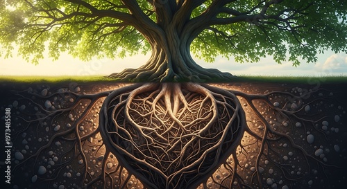 The intricate root and canopy system of a majestic ancient tree in nature's embrace. tree roots heart