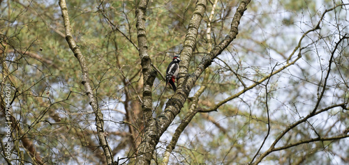 Dzięcioł duży (Dendrocopos major) siedzący na gałęzi, pniu drzewa, w lesie