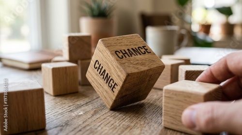 Wooden cube blocks arranged on a flat surface, one block bearing the word CHANGE turned to reveal CHANCE on an adjacent face, concept of transformation and new opportunity, warm natural wood grain