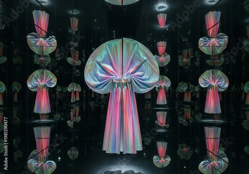 An avant-garde fashion display suspended within a vast hall of mirrors, creating a recursive reflection of fabric textures and emptiness, mirror, surreal, fabric