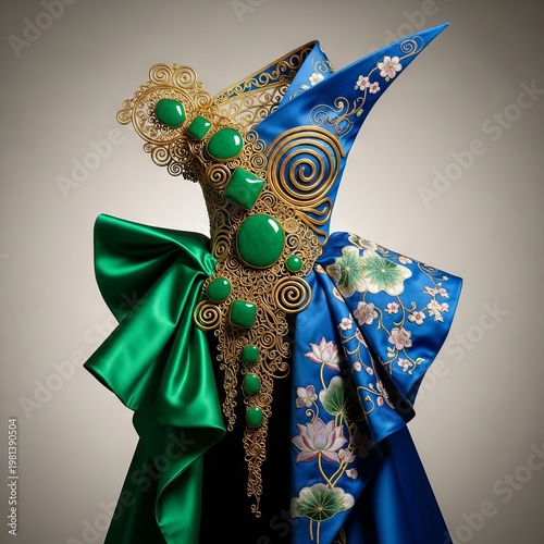 An avant-garde garment crafted from opulent silk, adorned with intricate gold filigree, precious jade stones, and sacred floral embroidery, opulent, handmade, needlework