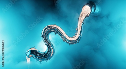 Molten platinum metal flows elegantly through luminous cyan vapor clouds, creating a high-contrast swirl with ultra-realistic reflections, background, mist, macro