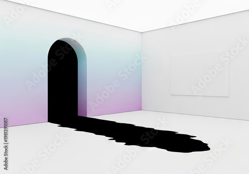 Pristine white gallery interior framing a vast dark abyss, capturing a serene sense of emptiness and the philosophical concept of the void, shadow, volume, silence