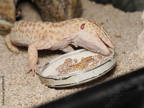 Un gecko leopardo de coloración clara se alimenta de larvas de tenebrio en un plato dentro de su terrario. Se aprecia su piel moteada, su ojo y su postura mientras captura una de las presas.