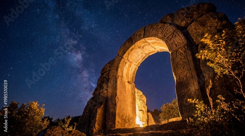 Majestic archway into galaxies concept. A majestic stone archway illuminated under a starry night sky.