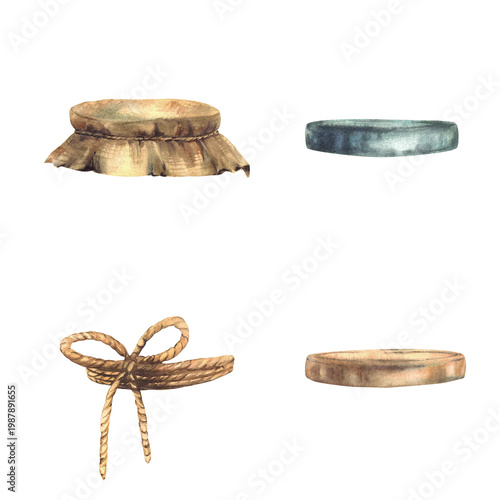 Set of jar lids, Gold, silver and Canvas burlap fabric lid tied with rope around. Watercolor vintage lid mix for glass preserving jars. Hand drawn illustration isolated from background for food design