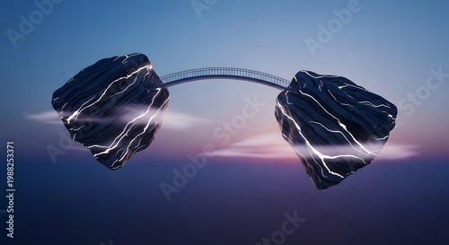 Surreal landscape of floating rock formations with a bridge connecting them at sunset