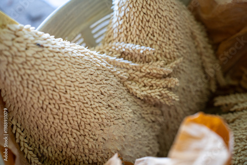 dense male date palm flower cluster (Phoenix dactylifera) in a basket. Detailed natural texture of palm inflorescence for agricultural pollination and botanical study concepts.