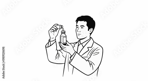 Man in lab coat carefully adds liquid drops from dropper to small bottle