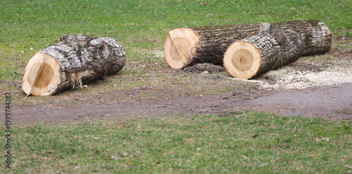 The sawn-off trunk of an old poplar tree lies on the lawn near the path