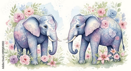 Two majestic blue elephants decorated with beautiful floral patterns stand gracefully together in this artistic watercolor illustration that highlights their intricate skin designs