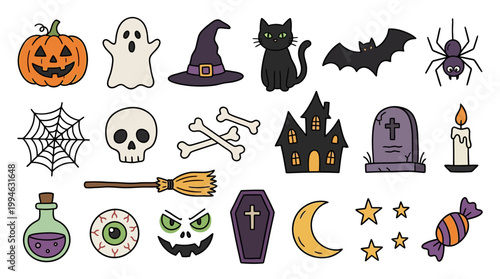Halloween symbols and icons including pumpkin ghost witch hat black cat spider web skull bones broom potion eyeball monster face coffin haunted house tombstone bats stars moon and candy corn. Element