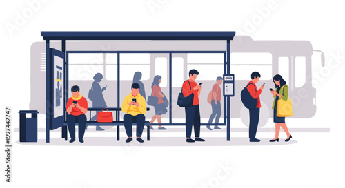 People at a bus stop, mostly engrossed in their smartphones while sitting and standing, with a bus silhouette in the background.