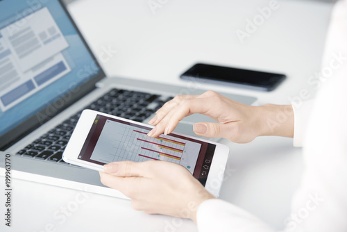 Close-up of businesswoman's hand touching digital tablet and analyzing financial data while sitting in front of laptop at office desk and working on new business report. Isolated on white background.