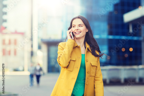 technology, communication and people concept - smiling young woman or girl calling on smartphone on city street