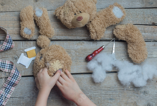 A girl sews a bear toy. Handicraft with children. Child fills the toy with a sintepon.