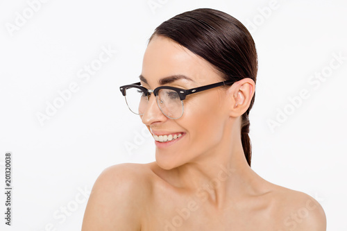 Beautiful smiling young woman wearing glasses to improve eyesight. Healthy vision