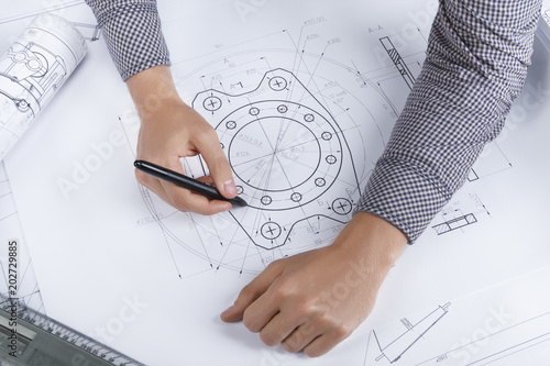 Engineer/ architect workplace. Top view on man / male hands making mechanical / architectural sketches of turbine with a pen and ruler.