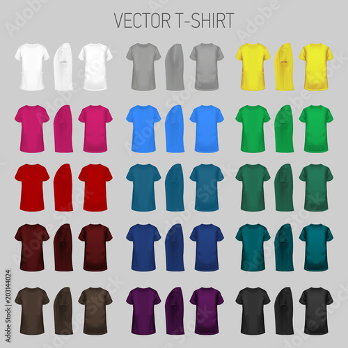 T-shirt templates collection of different colors for men and women in three dimentions: front, side and back view realistic gradient mesh vetor.